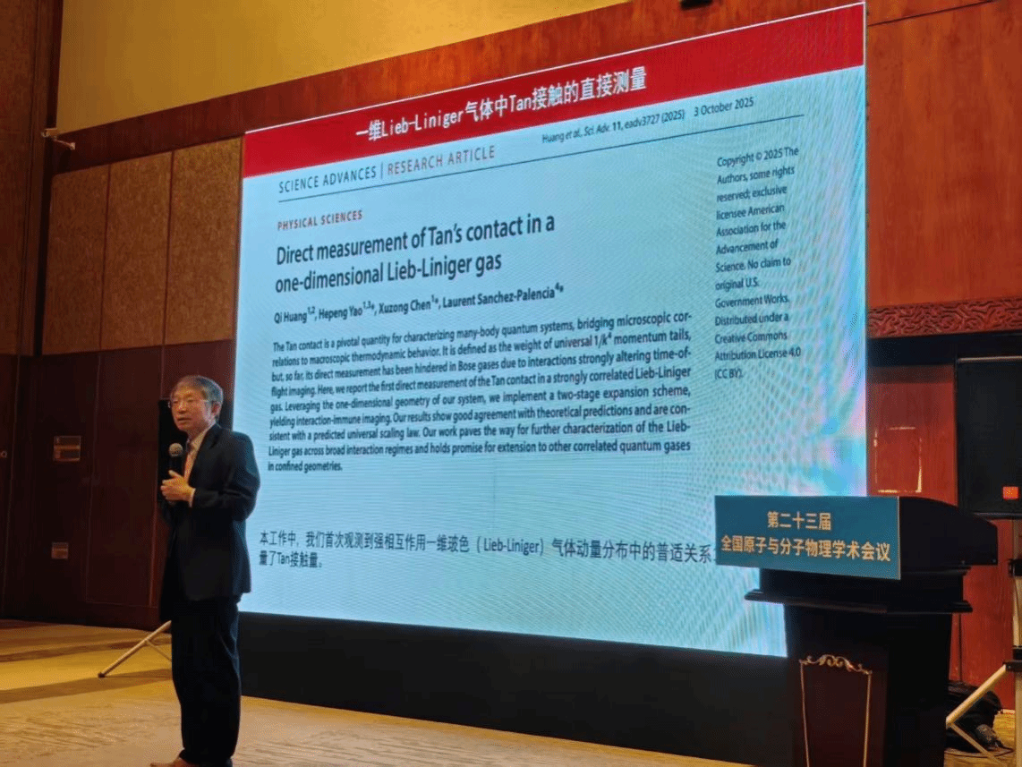 陈徐宗教授以“光晶格中的超冷原子动力学量子相变研究”为题做大会邀请报告,介绍了陈徐宗研究团队在铷原子动力学光学晶格的相变系列研究:三维超流到模特态kibble Zurek相变、一维超冷气体的Tan Contact碰撞系数测量、一维晃动光晶格中的莫特-π 超流相变,以及一维晃动光晶格中拓扑平庸相到拓扑非平庸相的相变等一系列前沿研究。这些研究属于量子模拟方向,部分成果已发表在2025年10月Science子刊《Science Advances》上。